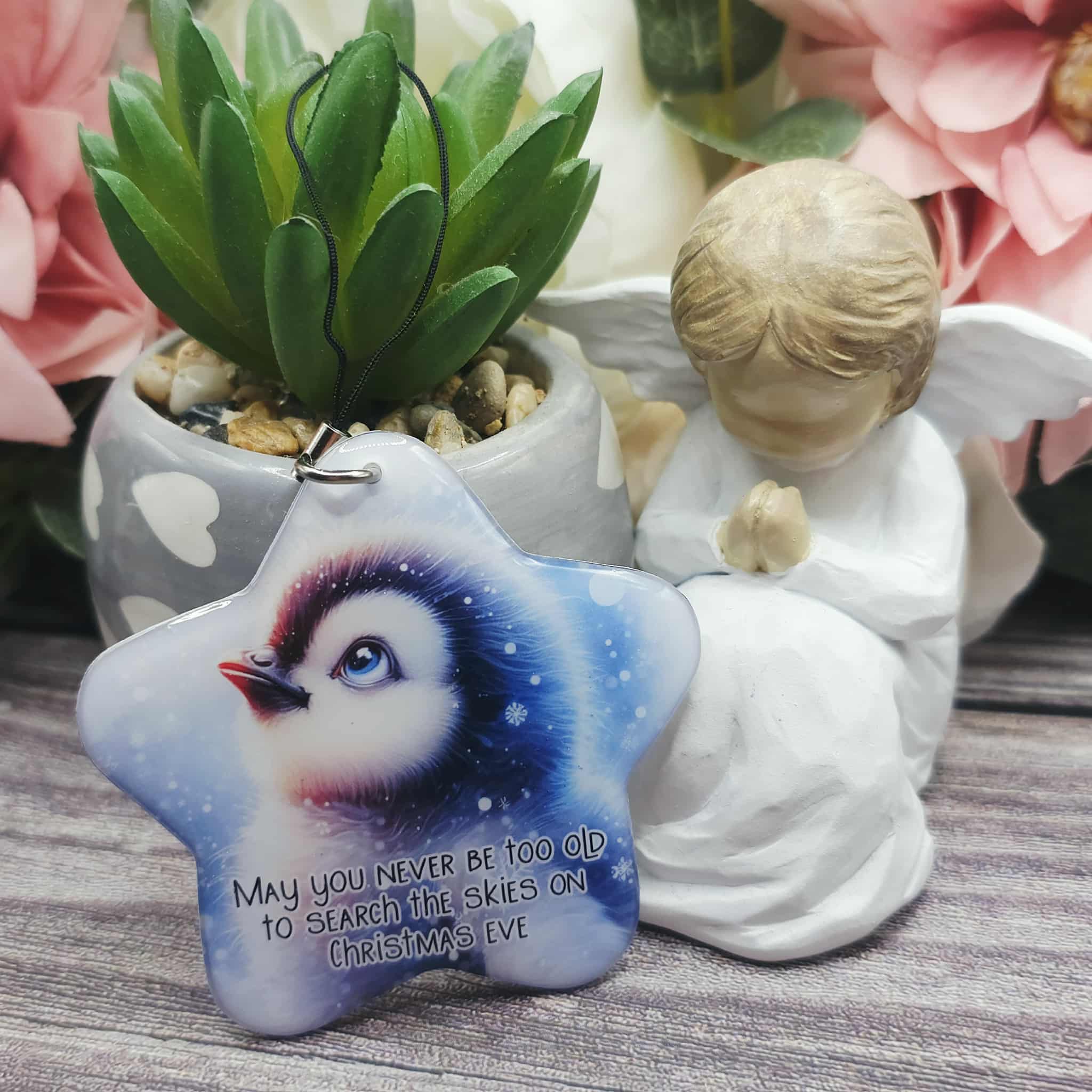May you never be too old to search the skies on christmas eve, Penguin Christmas star ornament, Christmas gift, keepsake